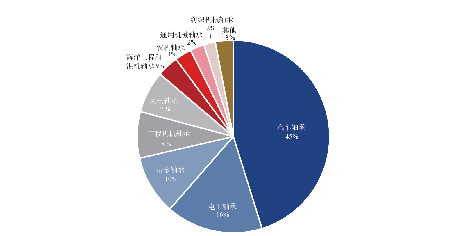 高碳鉻軸承鋼主要用于汽車、工程機(jī)械、內(nèi)燃機(jī)制造、電機(jī)車、機(jī)床、拖拉機(jī)、軋鋼設(shè)備、鉆探機(jī)械等傳動軸上的滾柱及軸套,滲碳軸承鋼主要應(yīng)用于鐵路機(jī)車及風(fēng)電行業(yè)。可以看出,汽車行業(yè)、電工行業(yè)、冶金行業(yè)、工程機(jī)械行業(yè)是軸承鋼的主要消費(fèi)領(lǐng)域。汽車工業(yè)是國內(nèi)軸承最大的應(yīng)用市場,約軸承鋼需求的45%,目前具有汽車行業(yè)配套資格、較為知名的主要有人本集團(tuán)、瓦軸、洛軸、錢潮軸承等。本土企業(yè)的產(chǎn)品主要用于乘用車中低端市場和商用車領(lǐng)域,一些規(guī)模大、知名度高的企業(yè)也進(jìn)入乘用車高端市場,不過配套比例較小。電工行業(yè)是軸承用鋼需求第二大行業(yè),占比為16%,冶金行業(yè)、工程機(jī)械及風(fēng)電行業(yè)需求占比則分別為10%、8%和 7%。根據(jù)中國軸承工業(yè)協(xié)會相關(guān)數(shù)據(jù),部分行業(yè)對配套軸承需求量占比如下頁圖3所示。
