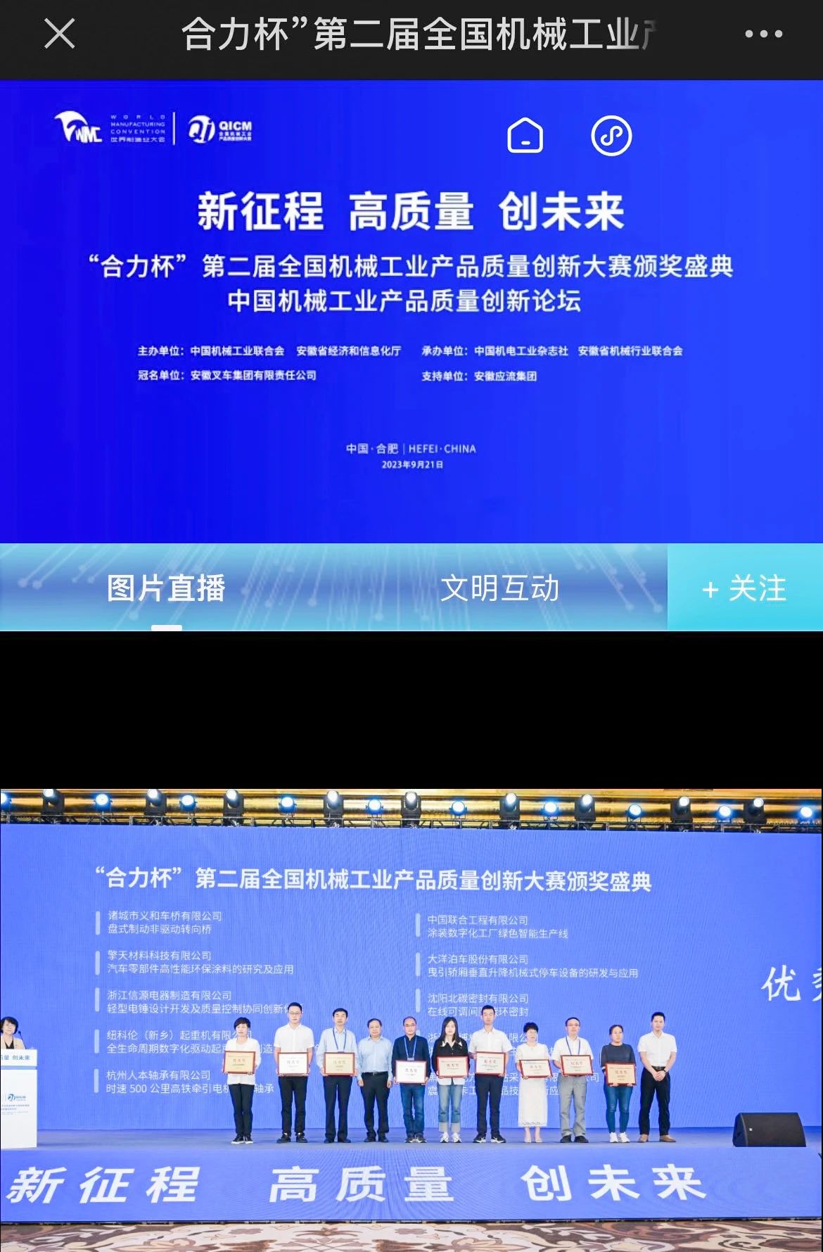 本次創(chuàng)新大賽是2023世界制造業(yè)大會(huì)和2023全國“質(zhì)量月”的重要活動(dòng),由中國機(jī)械工業(yè)聯(lián)合會(huì)和安徽省經(jīng)濟(jì)和信息化廳共同主辦?;顒?dòng)以“新征程、高質(zhì)量、創(chuàng)未來”為主題,推選一批技術(shù)先進(jìn)、一致性好、可靠性水平高、產(chǎn)品適應(yīng)性強(qiáng)的自主創(chuàng)新優(yōu)質(zhì)產(chǎn)品和優(yōu)秀企業(yè),促進(jìn)質(zhì)量變革創(chuàng)新,推動(dòng)機(jī)械工業(yè)高質(zhì)量發(fā)展。