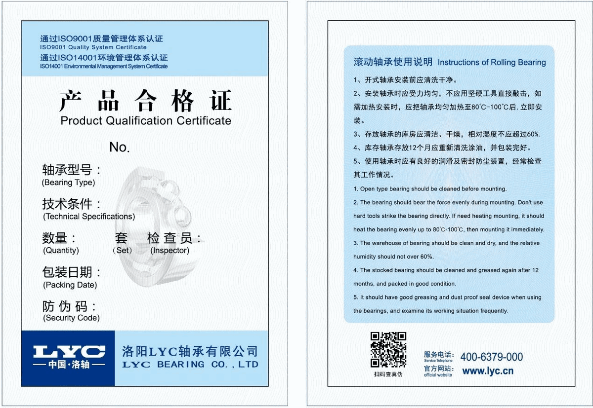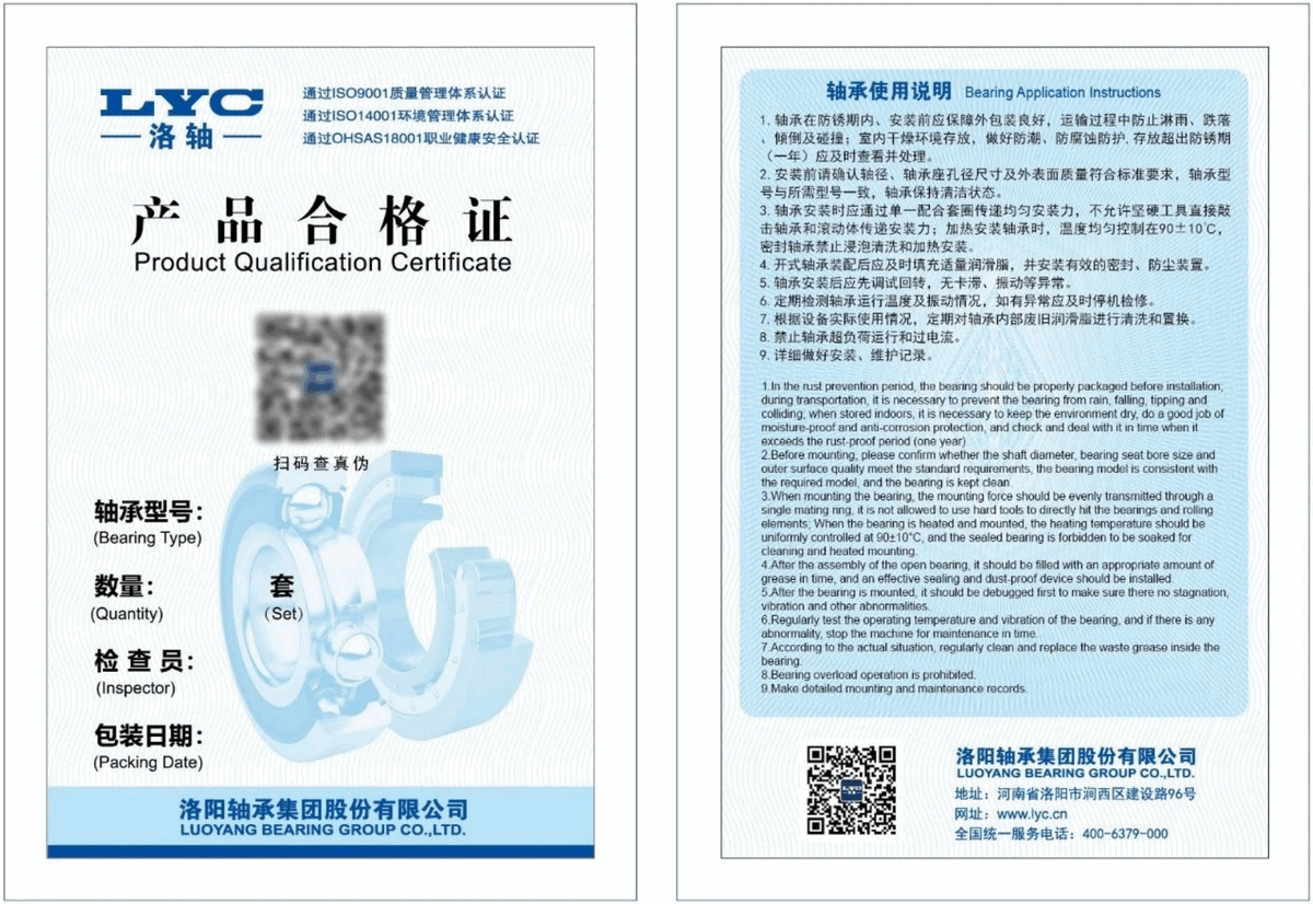 公司2024年初更名為洛陽(yáng)軸承集團(tuán)股份有限公司,根據(jù)業(yè)務(wù)需要及市場(chǎng)反饋等多方因素考慮,從即日起我司新出廠(chǎng)通用產(chǎn)品的合格證樣式將進(jìn)行改版,主要變更方面為去掉防偽碼及序列號(hào)的顯示,增加防偽二維碼,檢查員及日期印章變?yōu)橹苯哟蛴〉男问降?,改版后新版合格證防偽可以使用手機(jī)直接掃描二維碼按照系統(tǒng)提示進(jìn)行,舊版庫(kù)存產(chǎn)品的合格證防偽查詢(xún)方式不變,新舊兩種合格證將持續(xù)并行直至舊版產(chǎn)品消耗完畢。