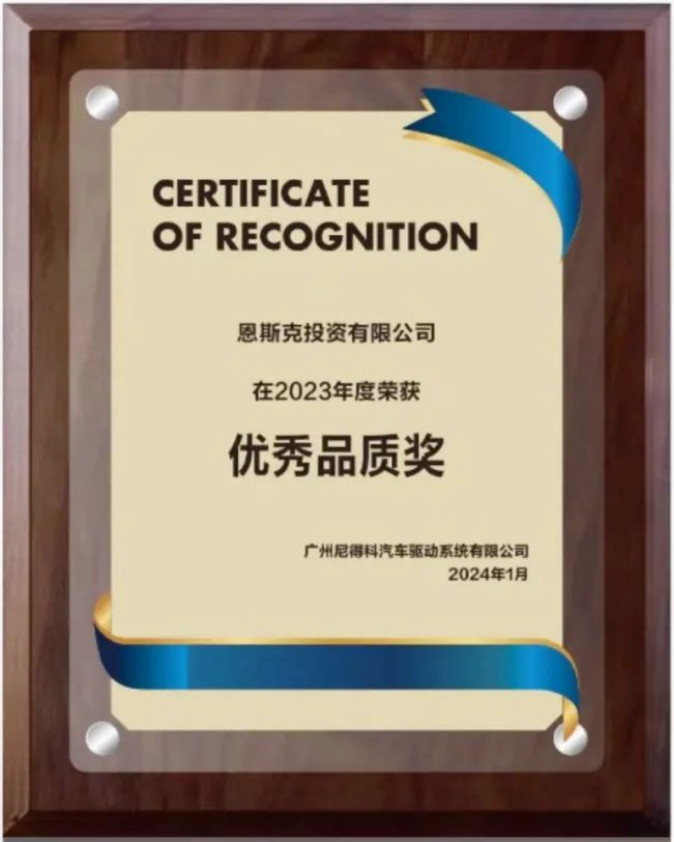 2024年4月,廣州尼得科汽車驅(qū)動系統(tǒng)有限公司(以下簡稱GNAD)正式授予恩斯克投資有限公司(以下簡稱NSK)2023年度“優(yōu)秀品質(zhì)獎”。本次是GNAD第一次設(shè)置此供應(yīng)商獎項,NSK憑借在研發(fā)、生產(chǎn)、品控等方面精益求精的表現(xiàn)獲得了客戶的高度認(rèn)可。NSK中國產(chǎn)業(yè)機(jī)械事業(yè)本部E&E統(tǒng)括部大客戶營業(yè)課陸嘉曦高級經(jīng)理代表公司上臺領(lǐng)獎。