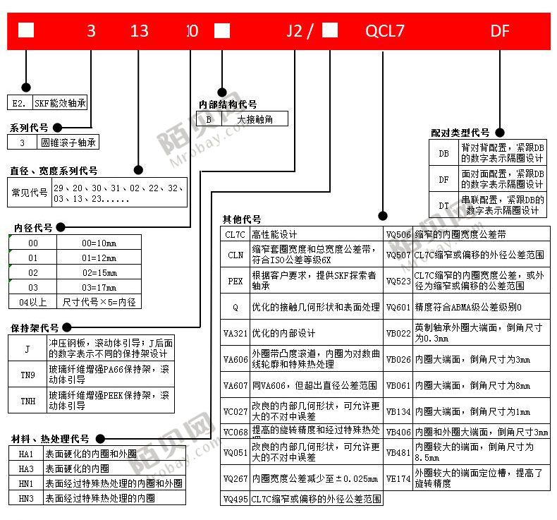 今天我們主要來了解和學習一下圓錐滾子軸承后綴字母的含義,不同品牌,后綴含義也略有差別,這里以SKF品牌的圓錐滾子軸承為例:
