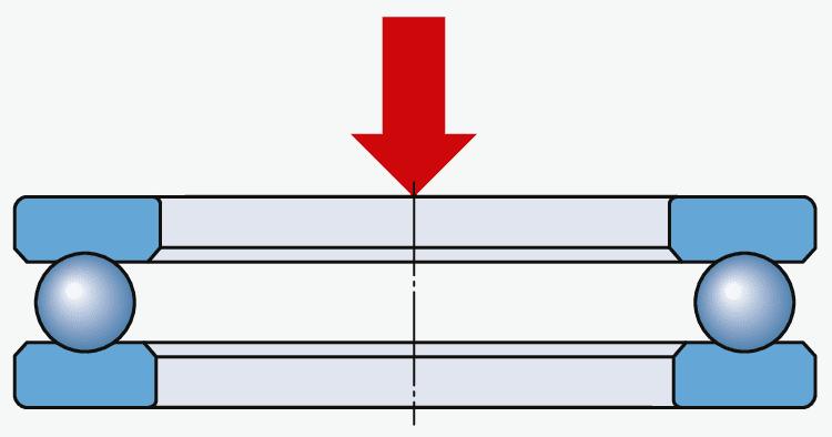 推力軸承主要承受沿著軸向方向載荷。根據(jù)設(shè)計(jì),推力軸承可以支撐單向或雙向的純軸向載荷(圖 5),但有些可以額外承受徑向載荷(聯(lián)合載荷,圖 6)。推力軸承不能達(dá)到與同尺寸徑向軸承一樣高的轉(zhuǎn)速。