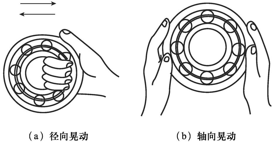 用手?jǐn)[動(dòng)滾動(dòng)軸承外圈(草坪播種機(jī)解體后)滾動(dòng)軸承拆下之后,用手向徑向方向晃動(dòng),如滾動(dòng)體有撞擊聲,則說(shuō)明間隙過(guò)大;用手軸向晃動(dòng)滾動(dòng)軸承,若內(nèi)、外圈之間松動(dòng)異常,也說(shuō)明滾動(dòng)軸承間隙磨損;如圖所示。