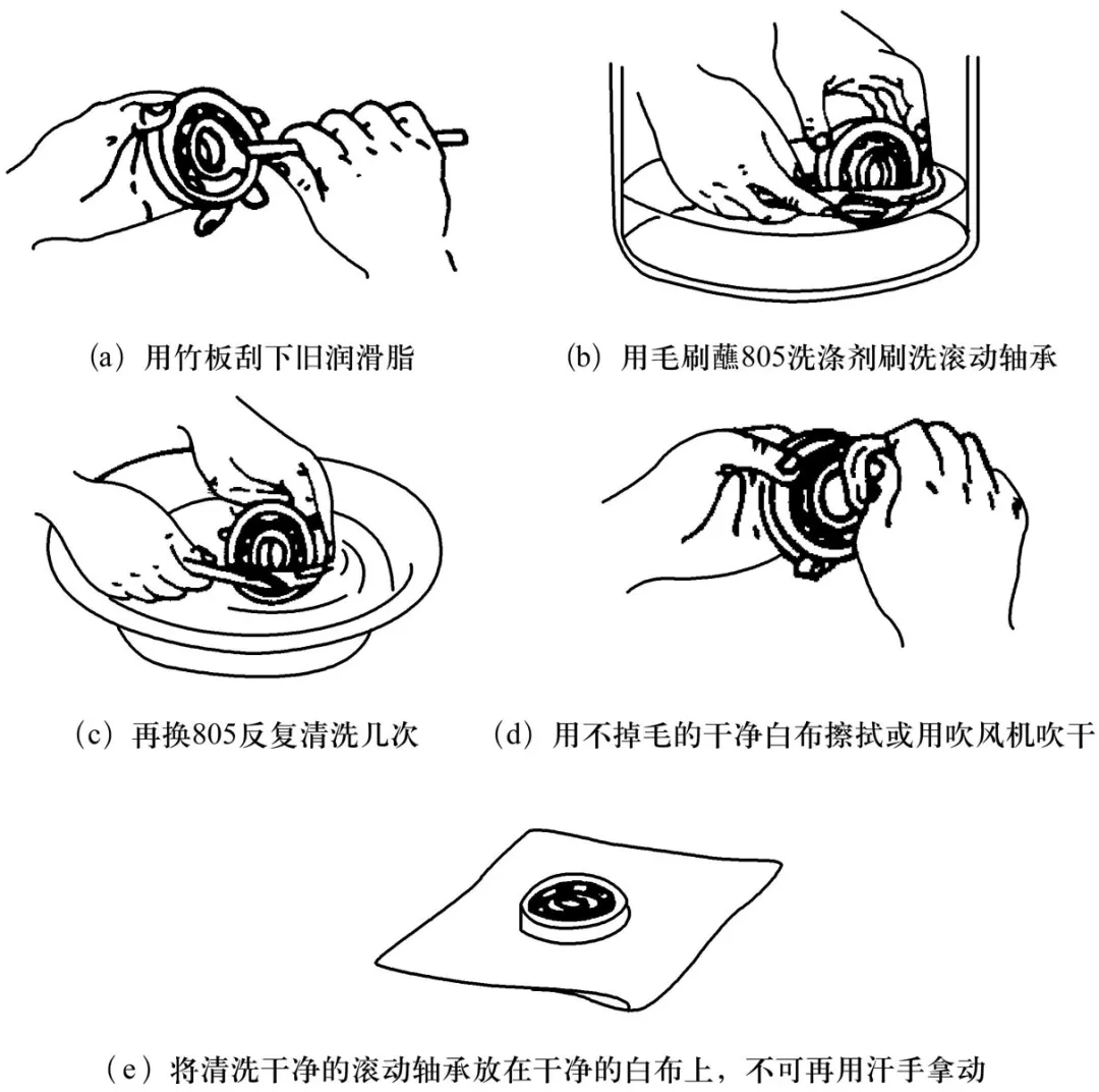 不同軸徑對(duì)應(yīng)的滾動(dòng)軸承的磨損許可值(4)滾動(dòng)軸承的清洗對(duì)拆下的舊滾動(dòng)軸承清洗的目的,是檢查滾動(dòng)軸承的質(zhì)量情況,以確定是否可繼續(xù)使用。建議采用805洗滌劑進(jìn)行清洗,首先將滾動(dòng)軸承內(nèi)的舊油用竹板刮凈,然后將805洗滌劑兌水(98%左右)加熱至60~70℃,就可用毛刷進(jìn)行清洗。采用805洗滌劑清洗滾動(dòng)軸承比用汽油或煤油的方法優(yōu)點(diǎn)是安全、無(wú)毒、節(jié)能、成本低。由于該洗滌劑具有暫時(shí)的防銹能力(能保持7天),所以不必?fù)?dān)心清洗后的滾動(dòng)軸承生銹。當(dāng)然除滾動(dòng)軸承外,對(duì)于滾動(dòng)軸承蓋、密封圈、轉(zhuǎn)動(dòng)配合部位以及端蓋滾動(dòng)軸承室等,均可用805洗滌劑進(jìn)行清洗,清洗后要擦干或吹干并涂上一層薄油。滾動(dòng)軸承的清洗方法如圖所示。