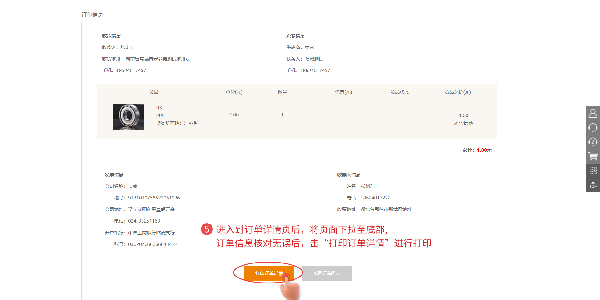 第5步:在訂單詳情頁(yè)面中將頁(yè)面下拉至底部,明細(xì)核對(duì)無誤后,點(diǎn)擊“打印訂單”進(jìn)行打印,打印訂單后,交予財(cái)務(wù)與發(fā)票進(jìn)行核對(duì)