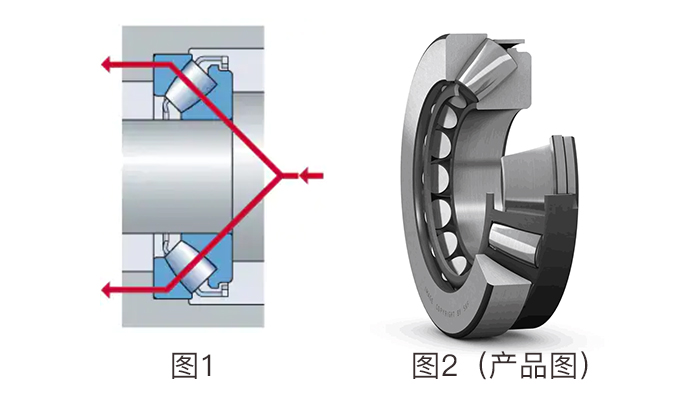 球面滾子推力軸承擁有特殊設計的滾道和不對稱滾子。 軸承可以承受沿一個方向作用的軸向載荷和同時作用的徑向載荷。 載荷在滾道之間通過與軸承軸線成一定角度的滾子傳遞,同時用擋邊引導滾子(如圖1)