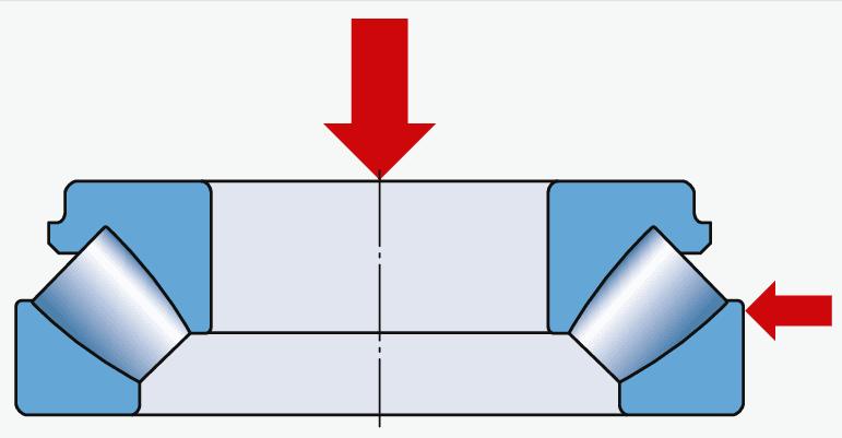 推力軸承主要承受沿著軸向方向載荷。根據(jù)設(shè)計(jì),推力軸承可以支撐單向或雙向的純軸向載荷(圖 5),但有些可以額外承受徑向載荷(聯(lián)合載荷,圖 6)。推力軸承不能達(dá)到與同尺寸徑向軸承一樣高的轉(zhuǎn)速。