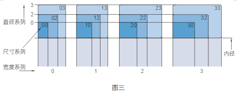 針對(duì)徑向軸承的 ISO 通用方案為每個(gè)標(biāo)準(zhǔn)內(nèi)徑提供了若干個(gè)標(biāo)準(zhǔn)外徑系列。 它們被稱(chēng)為直徑系列,并以 7、8、9、0、1、2、3 和 4 進(jìn)行編號(hào)(按外徑增加排序)。 在每個(gè)直徑系列中,存在不同的寬度系列(8、0、1、2、3、4、5 和 6,按寬度增加排序)。 圖三顯示直徑系列 0、2 和 3 以及寬度系列 0、1、2 和 3。